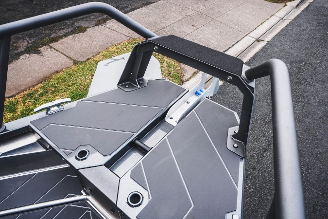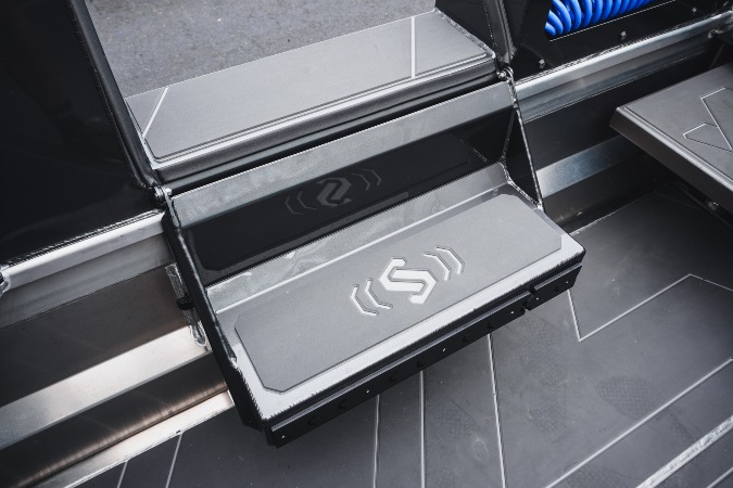 The Profish package takes comfort and style to the next level. Building on the Adventure and Sportfish offerings, it adds closed-cell baffled pontoons for quieter operation, 6mm EVA flooring in a choice of colours, twin blue underwater lights, ambient coaming and walkaround lighting, and a premium Fusion RA670 stereo with four speakers. Powder-coated rails match the cabin finish, and the exterior is completed in Stage 2 gloss paint extending to the base of the life-ring.